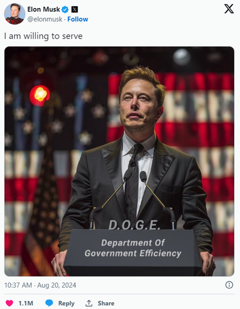 马斯克也曾经对这一设想有所透露。上月,他在X发布的一张图片中暗示了“政府效率部”的想法,并配文称,他已经准备好就职。